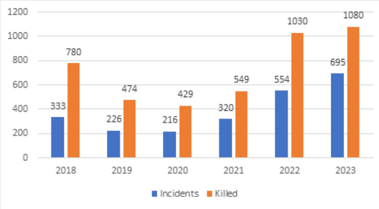 Pakistan’s supportive policies of the Taliban also have yielded untended consequences. The Taliban’s takeover has triggered debates on the future of the Pashtun community in Pakistan, whom Tehrik-e-Taliban Pakistan (TTP) situationally represents. Taliban released 1,500 TTP militants from jails, who are able to procure the latest military equipment. Since the Taliban’s takeover, the number of terrorist attacks more than doubled in Pakistan, which rose from 320 attacks in 2021 to 695 in 2023, as seen in Figure 1 below. The number of people killed in these attacks grew from 549 in 2021 to 1080 in 2023.