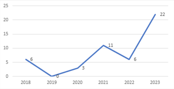 Pakistan has recorded increasing attacks by ISIS and Al Qaeda since the Taliban’s takeover. ISIS-K, based in Afghanistan, spreads its operational capacity in neighboring countries, as the group conducted attacks in Tajikistan, Uzbekistan, and Iran in 2022 and 2023. Its attacks in Pakistan rose from 6 in 2022 to 22 in 2023, as seen in Figure 4 below. Its 2023 attacks targeted Sunni imams who were against ISIS’s strict interpretation of the Qur’an, individuals who were accused of sorcery, Sikhs, Christians, tribal leaders, school teachers, and polio vaccination team members. The group targeted and opened fire on a police station in August 2023 and wounded a police officer. Another attack deployed a suicide bomber who detonated himself at a political rally in July 2023, killing 63 civilians and wounding 123 others. The group claimed responsibility for all its 2023 attacks, indicating its active presence and strength in the Khyber Pakhtunkhwa and Baluchistan regions.