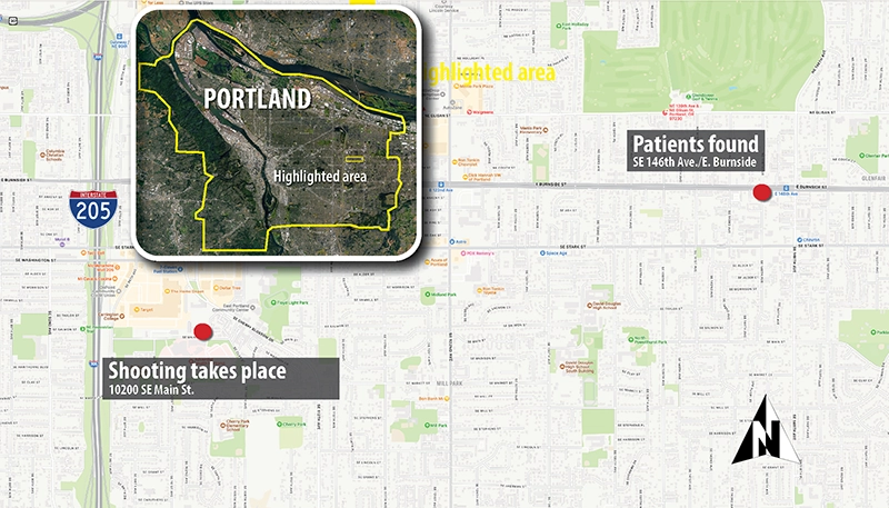 At 2:24 p.m., officers received information that a man who had been shot was calling and requesting help in the area of Northeast 146th Avenue and East Burnside. Officers responded and found a male and female with apparent gunshot wounds. Officers applied a tourniquet and summoned emergency medical personnel. The patients were transported to the hospital. Their conditions are unknown. Officers have determined the two people were injured in the shooting involving federal agents.