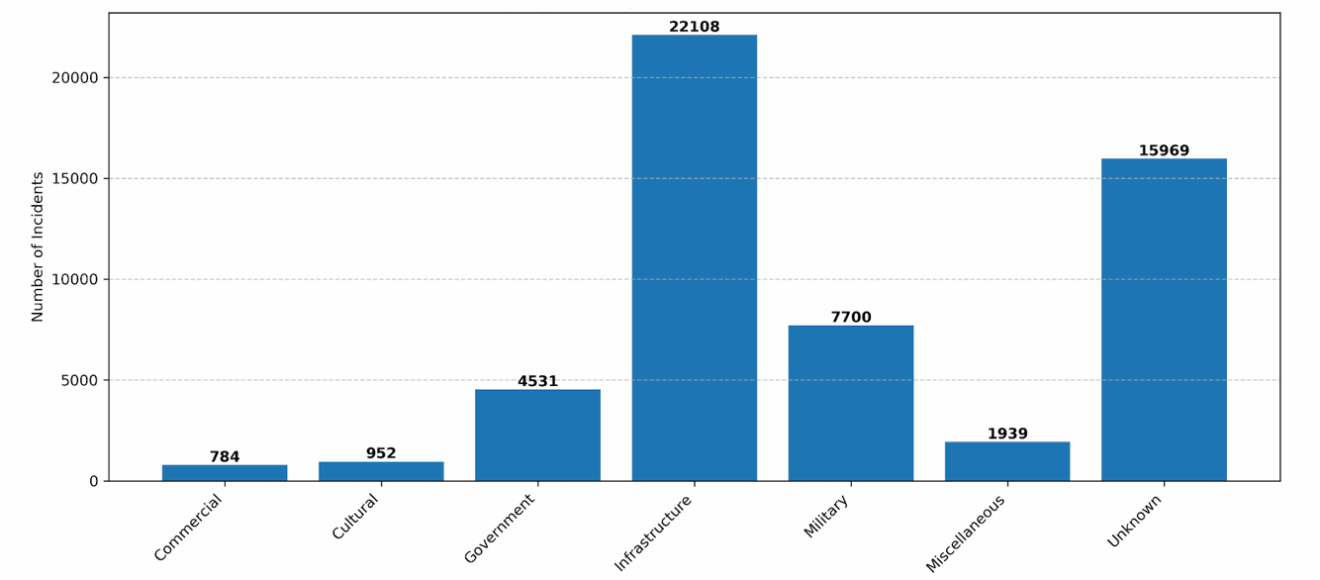 The GTTAC methodology relies on a wide range of reliable media sources, including both English and non-English outlets, to compile comprehensive data on terrorist incidents. Due to variability in media reporting and the occasional lack of detailed information about specific facilities targeted, a substantial portion of incidents fall into the “Unknown” category. This reflects challenges in precise facility classification rather than gaps in data collection, as shown in the accompanying figure, where the “Unknown” category accounts for 15,969 incidents.