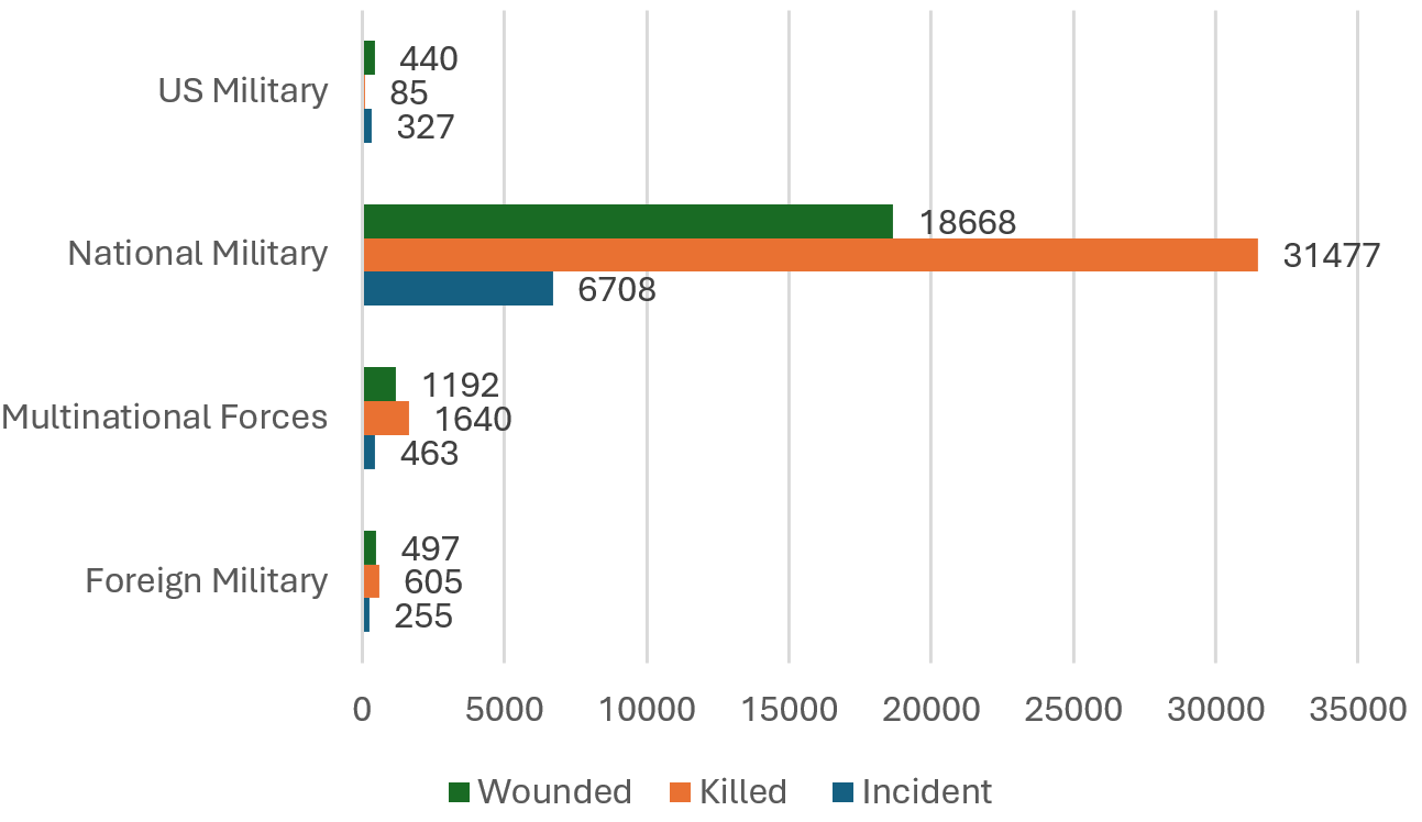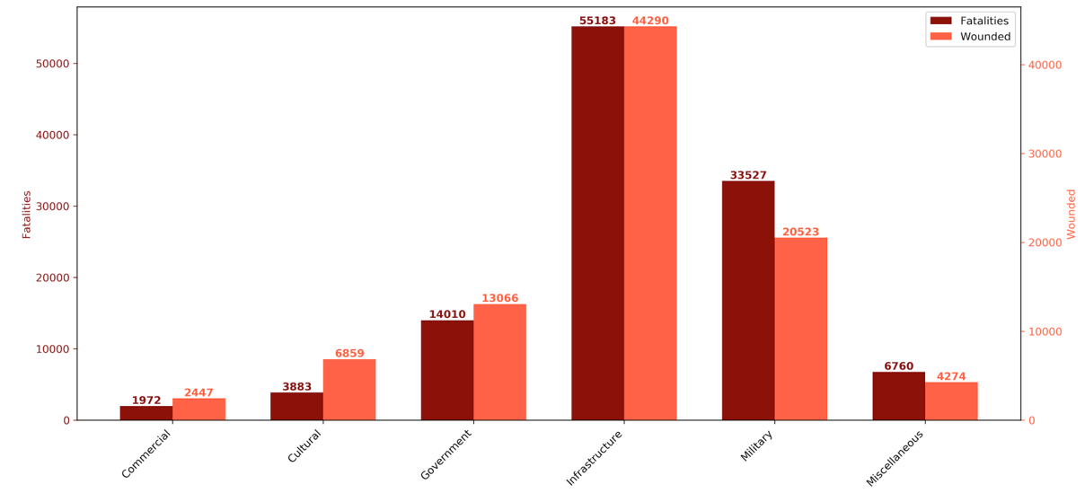 The data show that attacks on infrastructure resulted in the most casualties, with 55,183 deaths and 44,290 injuries. This confirms that infrastructure is the most targeted category and indicates that many sites—such as transportation systems, residential areas, schools, and healthcare facilities—are heavily populated and often lack sufficient protection, making them highly vulnerable.