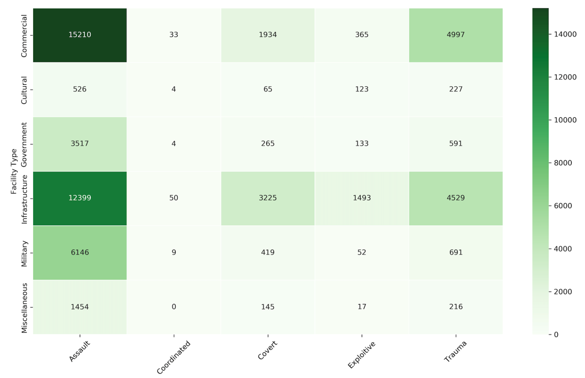 Terrorist organizations are rarely random or senseless in their acts of violence. Rather, their attacks are often strategically planned to reflect their ideological goals, operational capabilities, and political objectives. While some groups are selective in targeting military and law enforcement personnel, others adopt a more indiscriminate approach, directing violence toward infrastructure, commercial centers, or cultural landmarks. The Global Terrorism Trends and Analysis Center (GTTAC), operating under the US Department of State, has compiled extensive records on global terrorist incidents, documenting over 60,000 cases from January 2018 to June 2025. These records include detailed variables such as perpetrator group, attack type, victim category, logistical details, and—critically—the type of facility targeted. Facility types are classified into six categories: commercial, government, cultural, infrastructure, military, and miscellaneous.