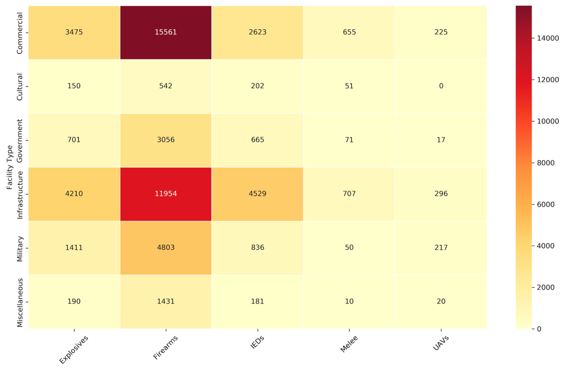 A comparative overview of the weapon types used by terrorist groups across facility categories is presented in Figure 4. The data reveals that firearms are the most commonly used weapon, with 15,561 attacks on commercial facilities and 11,954 on infrastructure facilities, highlighting the most active areas. Explosives and improvised explosive devices (IEDs) are also prominent, accounting for 3,475 and 2,623 attacks on commercial targets, and 4,210 and 4,529 attacks on infrastructure targets, respectively. In contrast, melee weapons and unmanned aerial vehicles (UAVs) are seldom used, with incidents rarely surpassing 700 cases for melee weapons and fewer than 300 cases for UAVs across all facility types. Overall, the figure demonstrates a strong reliance on firearms and explosive devices in attacks on commercial and infrastructure facilities, emphasizing the continued vulnerability of these sectors to conventional terrorist tactics.
