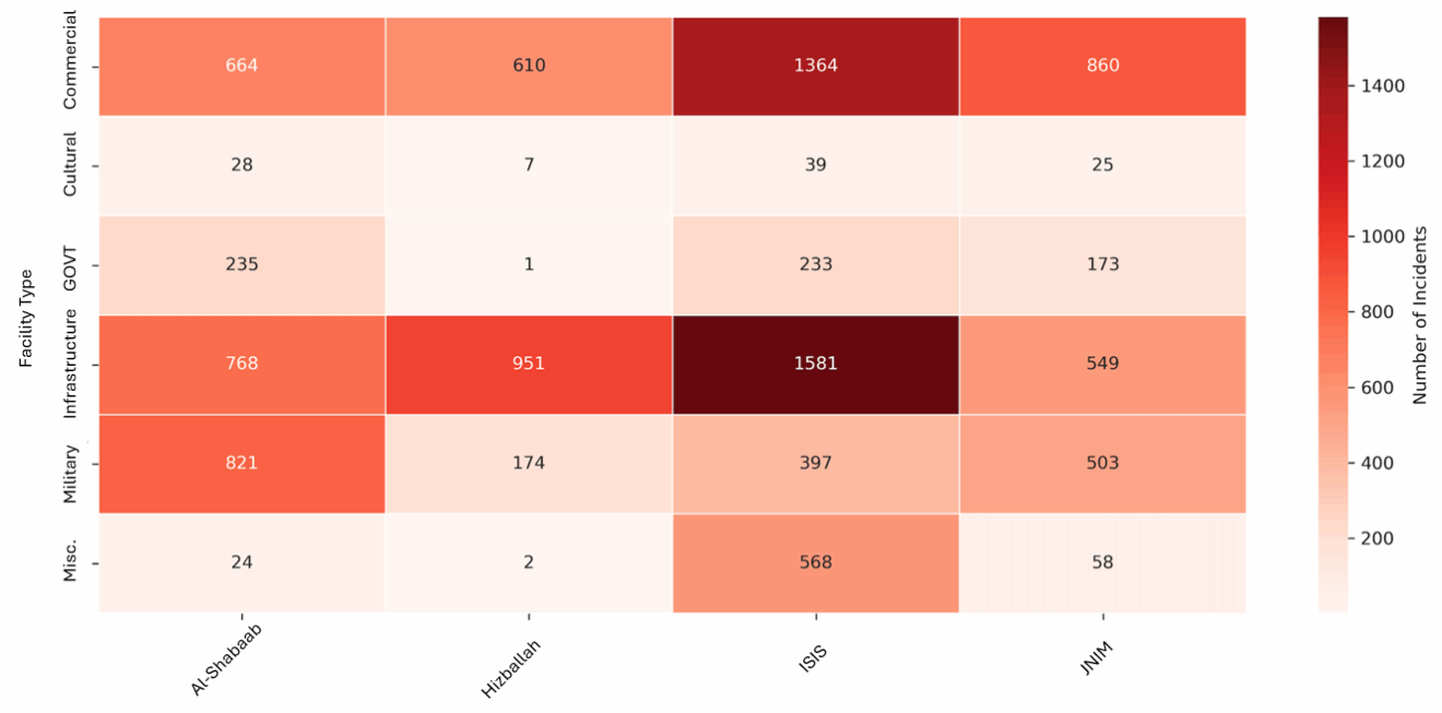 The heatmap in Figure 5 shows the number of incidents carried out by major terrorist groups—Al-Shabaab, Hizballah, ISIS, and Jama’at Nusrat al-Islam wal-Muslimin (JNIM)—against various facility types. The color intensity indicates how often attacks occur, with darker shades representing higher incident counts. The data reveal that ISIS is responsible for the most attacks overall, mainly targeting commercial (1,364 incidents) and infrastructure (1,581 incidents) sites. Al-Shabaab also displays significant activity, with 821 attacks on military and 768 on infrastructure sites. Hizballah’s operations are more limited, focusing mainly on infrastructure (951) and commercial (610) targets. JNIM shows a balanced pattern, with 860 attacks on commercial and 503 on military sites.