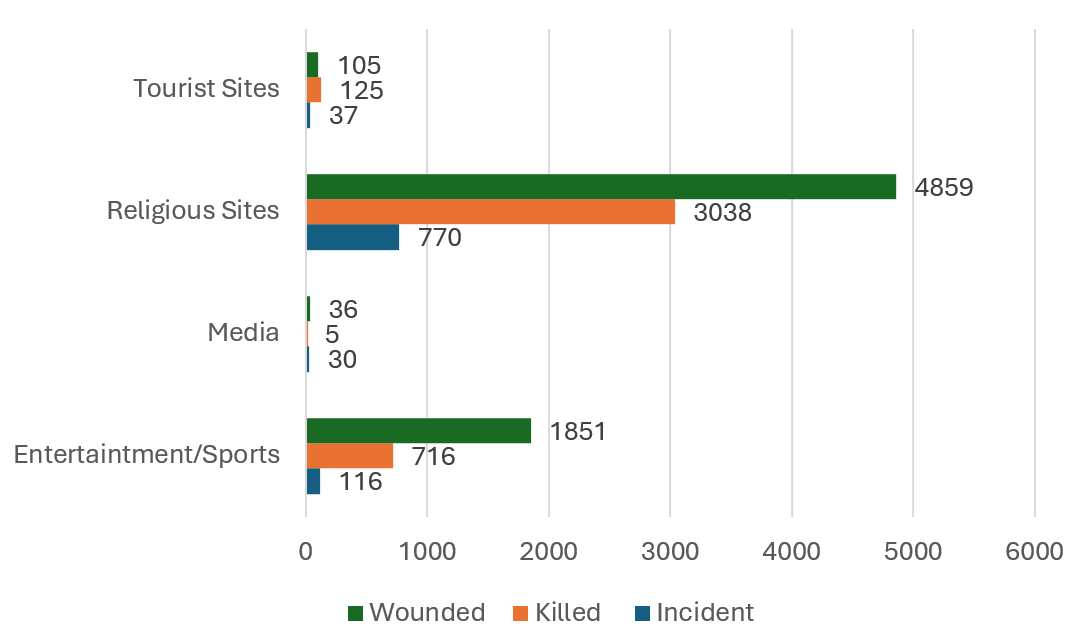 Cultural and religious sites. As illustrated in Figure 6, terrorist attacks on cultural and religious sites result in disproportionately high casualties. Religious sites alone recorded 770 attacks, causing 3,038 deaths and 4,859 injuries. Entertainment and sports venues also suffer significant human losses, while tourist sites, despite fewer fatalities, still experience notable injuries. Several factors contribute to this pattern: first, cultural and religious sites are often densely populated during events or worship, increasing the risk of casualties. Second, these sites hold symbolic and ideological importance, making them prime targets for terror groups aiming to inflict psychological trauma and undermine community identity. Third, attacks on such locations attract extensive media coverage, amplifying the terror group’s message and propaganda. Finally, targeting tourist and cultural sites disrupts local economies that depend on tourism, adding economic damage to the human toll. Collectively, these factors explain why terror groups focus on cultural sites, seeking to maximize both physical destruction and broader societal impact.