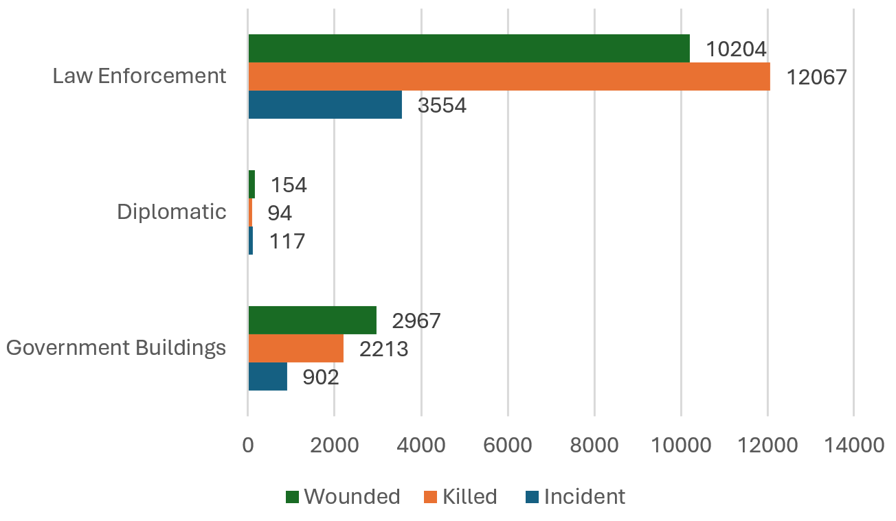 Government institutions and law enforcement. As shown in Figure 7, terrorist attacks on government sites often result in significant casualties. Law enforcement agencies were the most frequent targets, with 3,554 attacks leading to 12,067 deaths and 10,204 injuries. The relatively high number of fatalities compared to the wounded in attacks against law enforcement suggests that perpetrators are often well-prepared and specifically trained to carry out highly deadly operations against security personnel. Government buildings and diplomatic sites are also subjected to severe assaults, highlighting their symbolic and strategic importance. Terrorist groups often target these locations to directly challenge state authority, disrupt governance, and weaken the operational capacity of security forces, thereby maximizing their impact on public order and political stability.