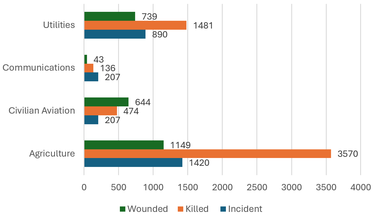 Critical Infrastructure. According to Figure 8, attacks on critical infrastructure cause significant human casualties, underscoring their potential to disrupt essential services and endanger civilians. Agricultural facilities experience the most attacks (1,420), causing 3,570 deaths and 1,149 injuries, highlighting the vulnerability of essential food production and supply chains. Utilities, including power and water services, also face substantial human losses, with 890 incidents leading to 1,481 deaths and 739 injuries, emphasizing the disruptive potential of assaults on vital public services. Civilian aviation is another major target, with 207 attacks resulting in 474 deaths and 644 injuries, demonstrating the devastating impact of attacking transportation infrastructure. Communications facilities, though attacked less often (136), still see 207 deaths and 43 injuries, underscoring their strategic importance in information and coordination networks. Overall, terrorist attacks on critical infrastructure aim not only to cause human casualties but also to disrupt essential systems, thereby threatening societal stability and economic resilience.