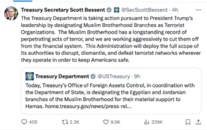 Foreign financial institutions face potential secondary sanctions if they knowingly conduct significant transactions on behalf of the designated groups. Treasury Secretary Scott Bessent emphasized the administration’s commitment to cutting the Muslim Brotherhood off from the financial system.