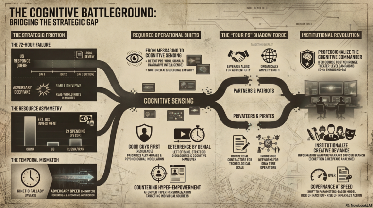 The NSS identifies “destructive propaganda” as an ever-increasing threat, where adversaries can weaponize “hyper-empowered individuals,” bots, and algorithmic amplification to saturate the environment instantly. It has evolved from broad, state-level propaganda to precision cognitive strikes against both civilians and individual warfighters alike. Douglas Wilbur illustrates this with the theoretical but terrifying case of “Specialist Jones,” a soldier neutralized not by a bullet, but by an AI system that scrapes his social media, identifies his impulsivity, and targets him with a customized deepfake of his wife committing adultery. Within an hour, a trained operator is removed from the fight at negligible cost to the adversary. This is the new reality: AI allows adversaries to scale “hyper-personalization” instantly.