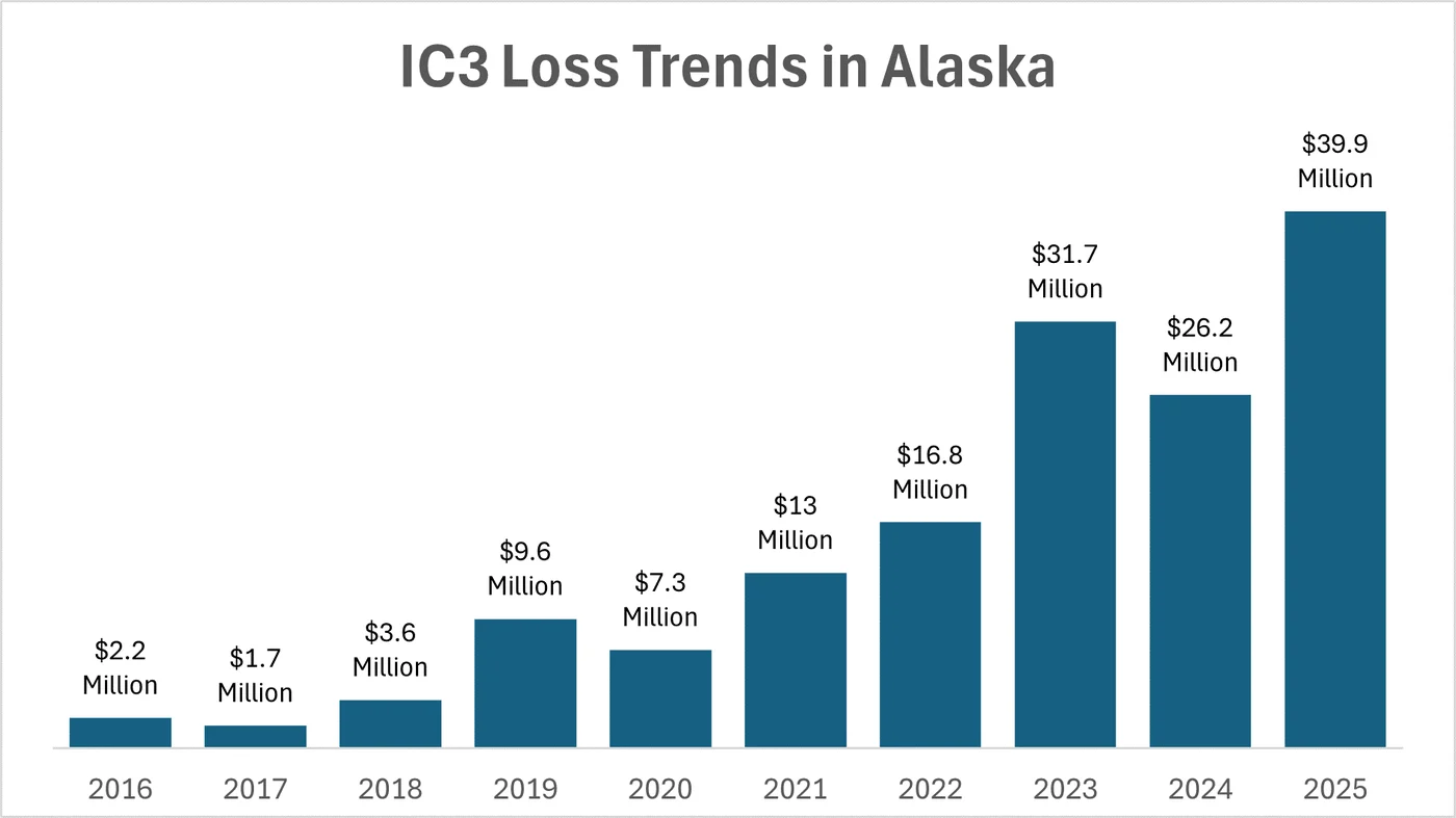 According to the 2025 report, Alaskans filed 3,202 complaints to IC3 with reported losses of nearly $40 million – a 52% (over $13.6 million) increase in losses from 2024. In Alaska, approximately 46% (over $18.6 million) of reported losses were cryptocurrency related.