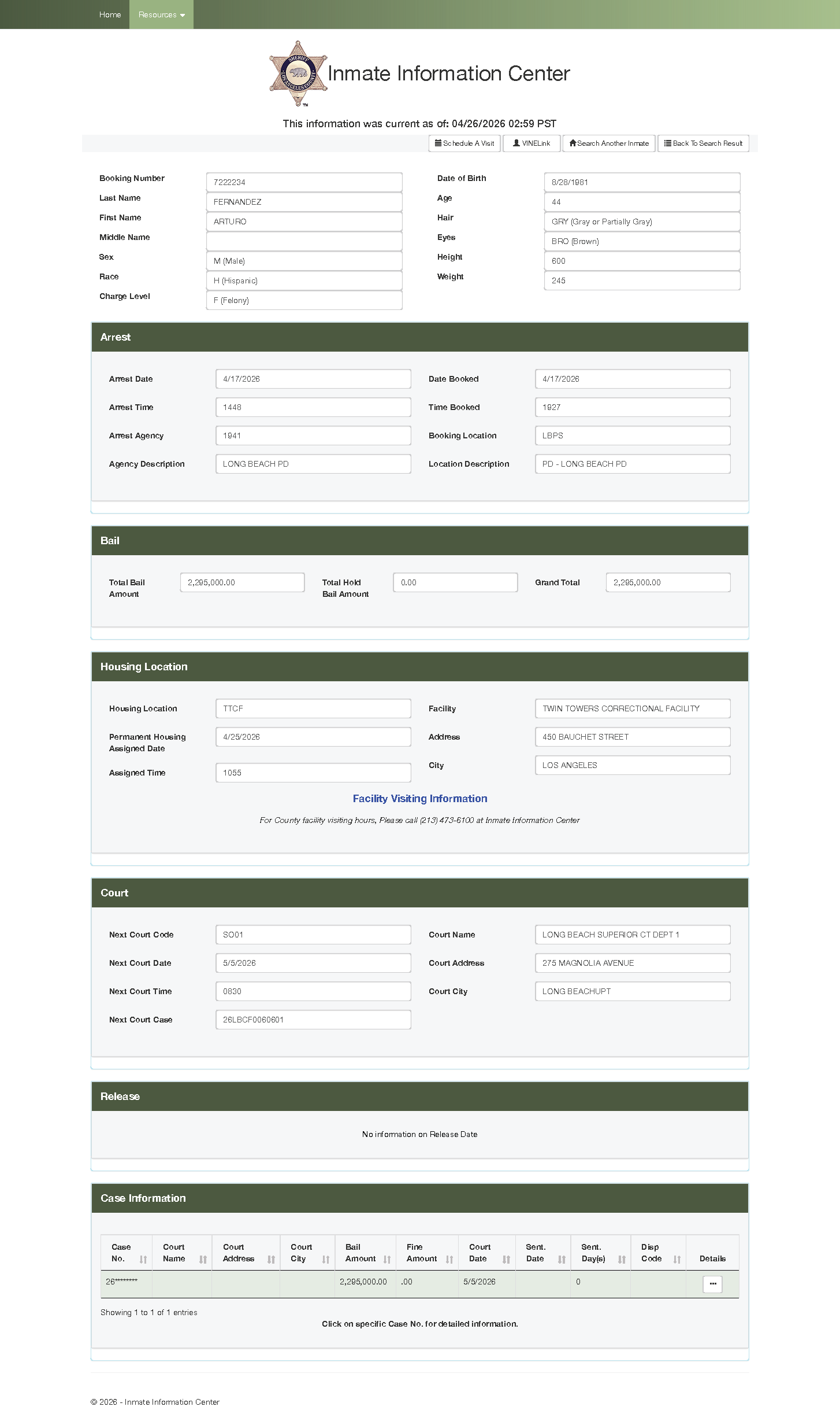 Fernandez was charged on April 23 in Los Angeles County Superior Court with one felony count of attempted murder of a peace officer, two felony counts of assault upon a peace officer, and two felony counts of resisting an executive officer. Prosecutors further allege that Fernandez acted willfully, deliberately, and with premeditation, and that he personally inflicted great bodily injury using a deadly and dangerous weapon. The court set bail at $2.295 million. Fernandez remains in custody, with arraignment scheduled for May 5 at the Long Beach Courthouse.