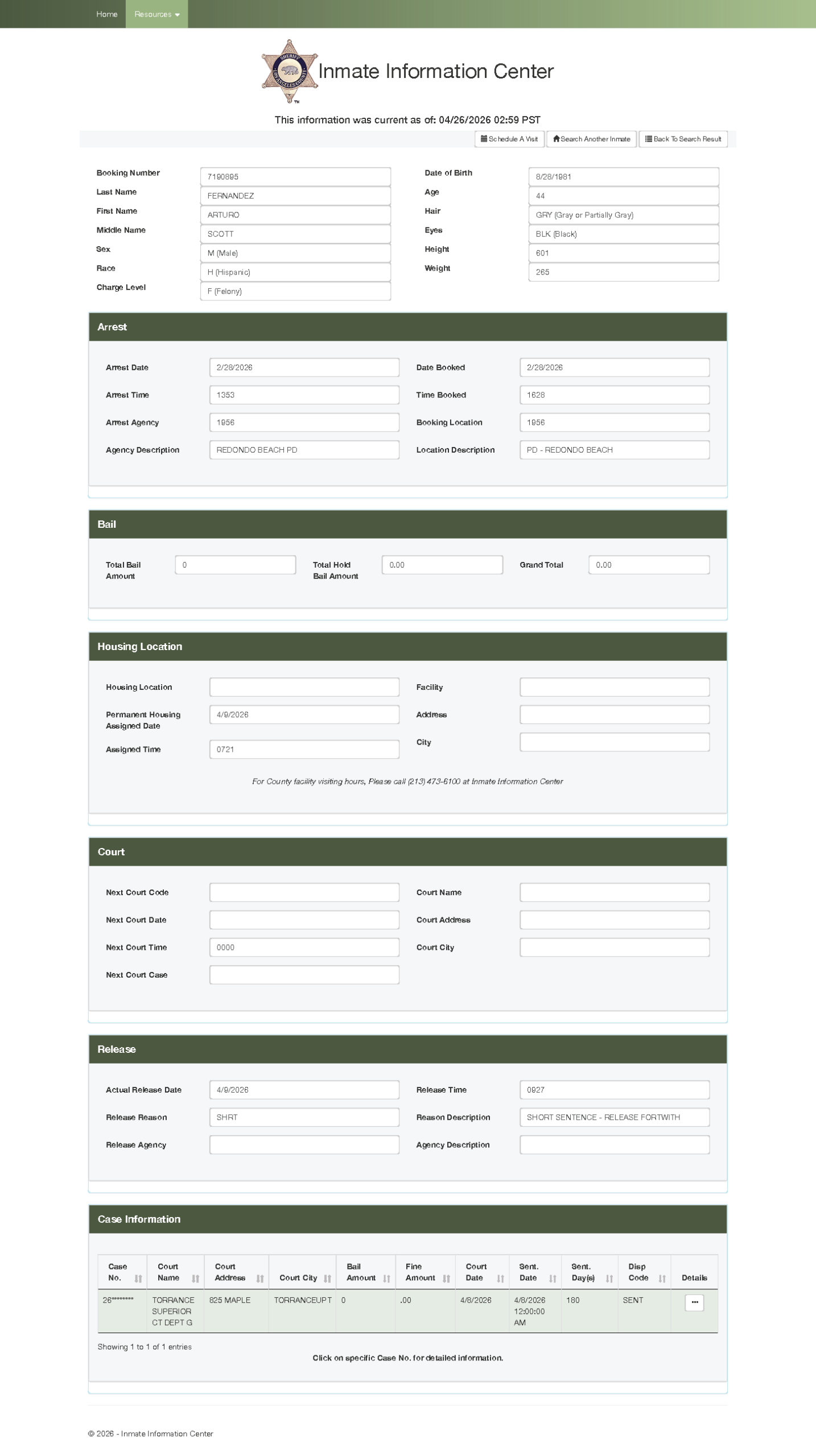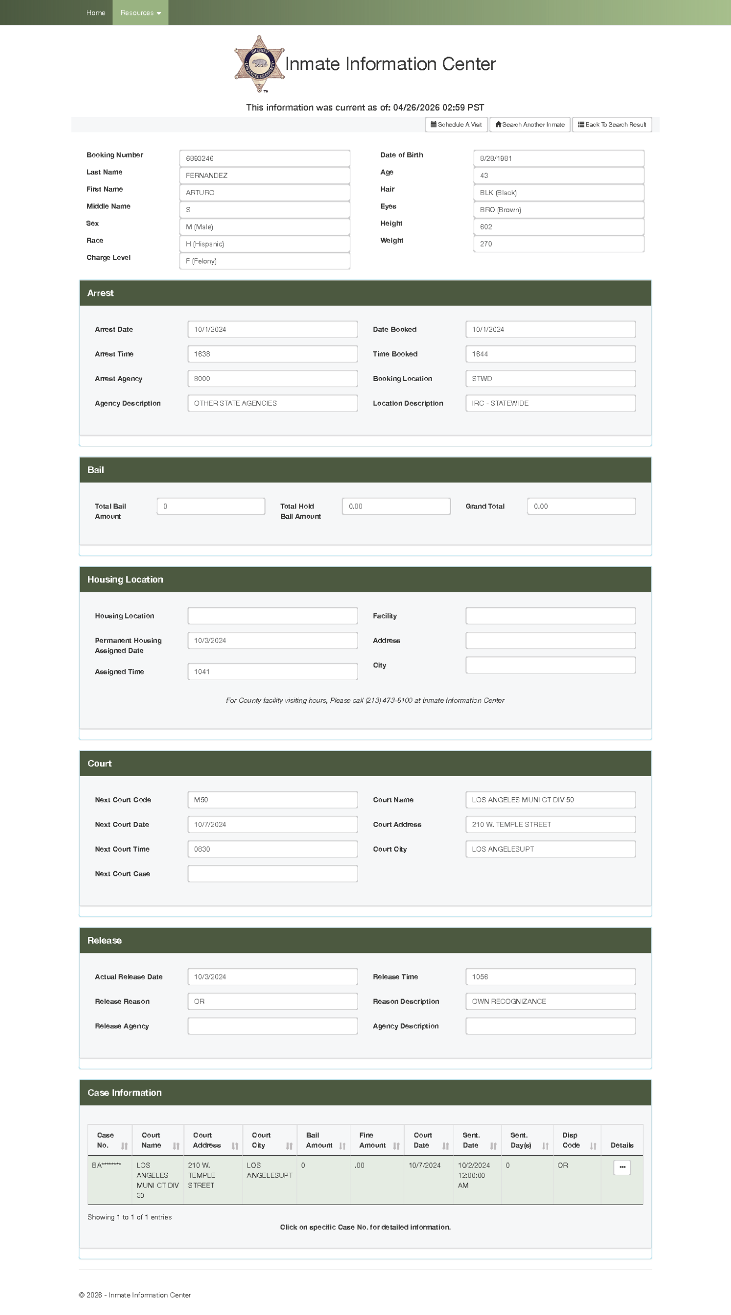 A sampling of his arrest record from Los Angeles County shows a persistent criminal history. On October 1, 2024, Fernandez was arrested on a felony charge and released just two days later on his own recognizance. A misdemeanor arrest followed on December 4, 2025. Then, on February 28, 2026, he was arrested again on a felony charge, and served what amounted to a short sentence before being released on April 9, 2026. Eight days later, he allegedly stabbed a police officer in the head and torso.