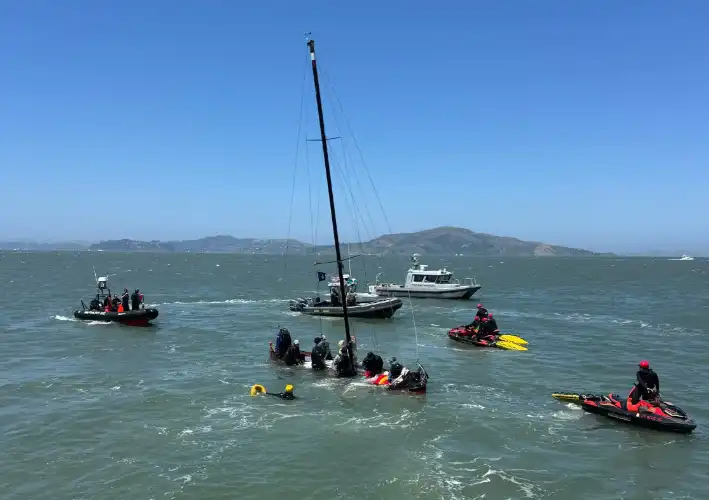 At 1:38 p.m., Coast Guard Sector San Francisco Command Center received a call that the 30-foot sailing vessel, Viking, was taking on water near Gashouse Cove.