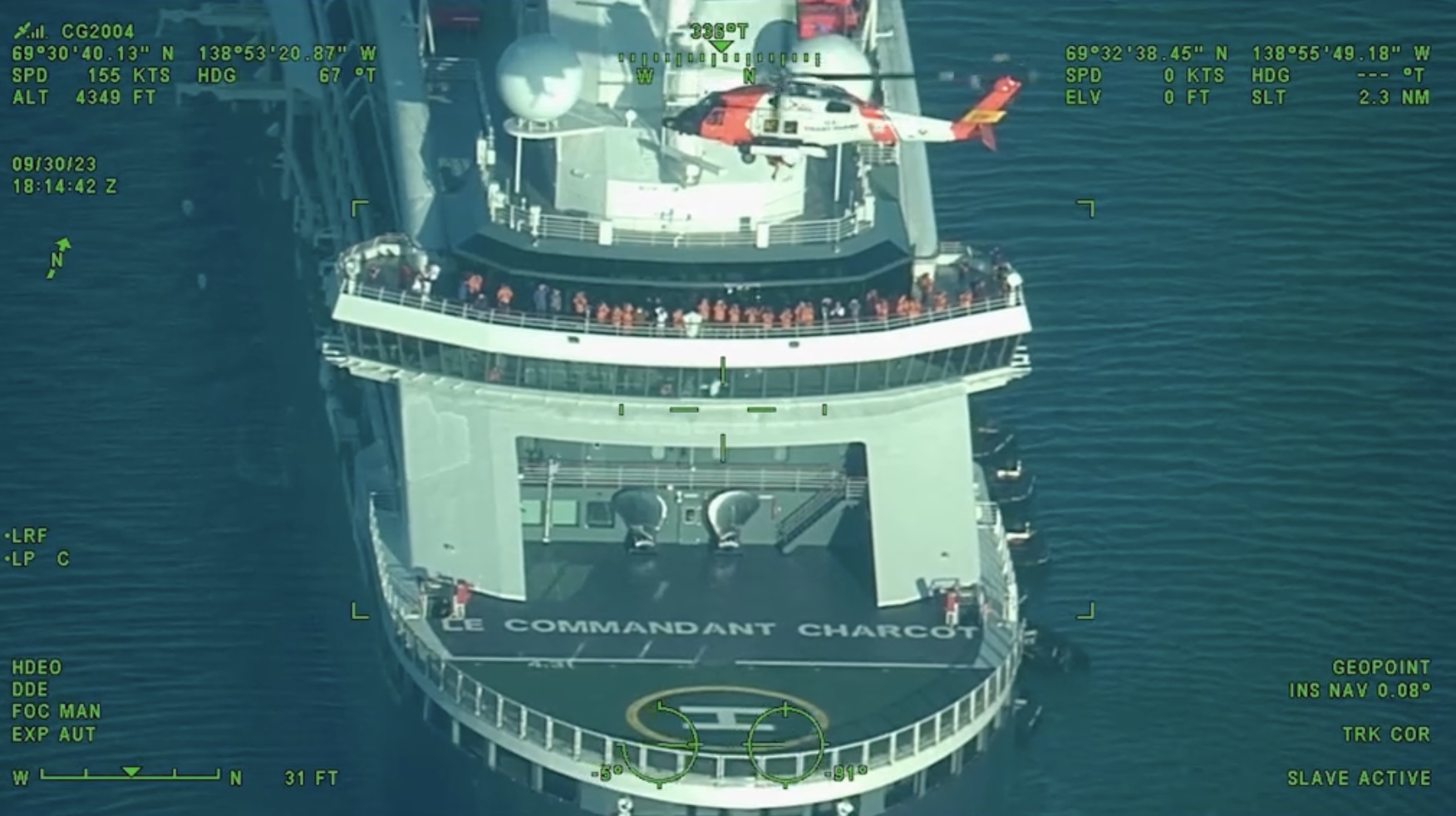 A U.S. Coast Guard MH-60 Jayhawk helicopter crew from Air Station Kodiak also responded by lowering a rescue swimmer onto the deck of the cruise ship to hoist mannequins acting as injured crew members.
