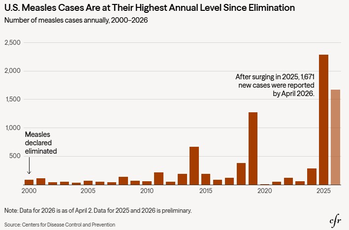 “The consequence of other countries losing their [measles] elimination status means the world is less prepared for serious disease threats,” Jennifer Nuzzo, director of Brown University’s Pandemic Center, told CFR. “It means we have lost abilities to prevent, detect, and respond to them. It should be considered the canary in the coal mine for what could happen in even more severe scenarios.”