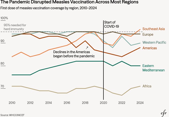 The pandemic, which began in 2020, only exacerbated this trend as lockdowns, transportation restrictions, and health-care system strains caused many children to miss their scheduled measles inoculations.